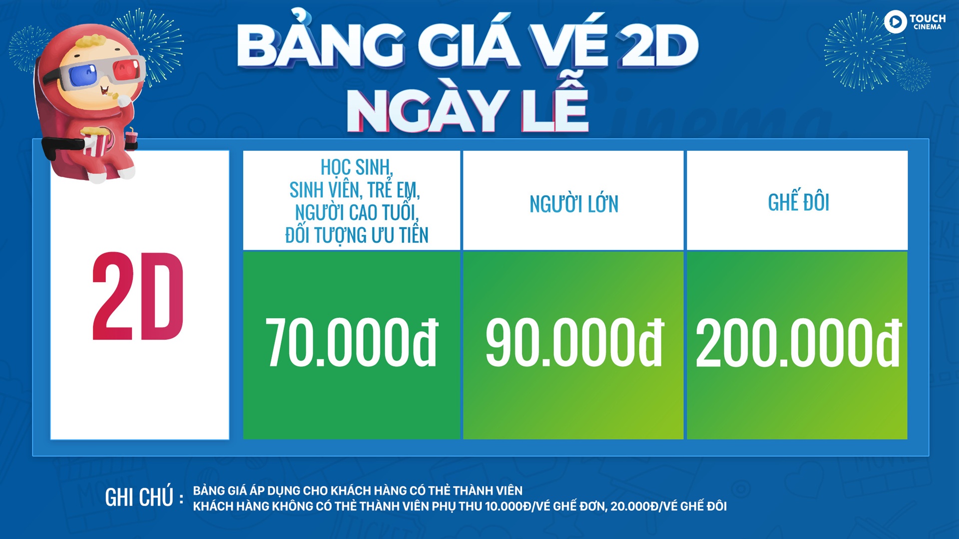 - Bảng giá trên áp dụng cho khách hàng có thẻ thành viên, khách hàng không có thẻ thành viên phụ thu 10.000đ/vé đối với ghế thường, 20.000đ/vé đối với ghế đôi